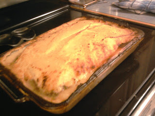 Evenly spread the mashed potatoes on top of the meatloaf. Trust me, you want the stuff to be all sitting in the large casserole dish fairly evenly. Otherwise you'll end up with meat spots less/more cooked than others, and the potatoes might burn in places....it's just best to have it even!
